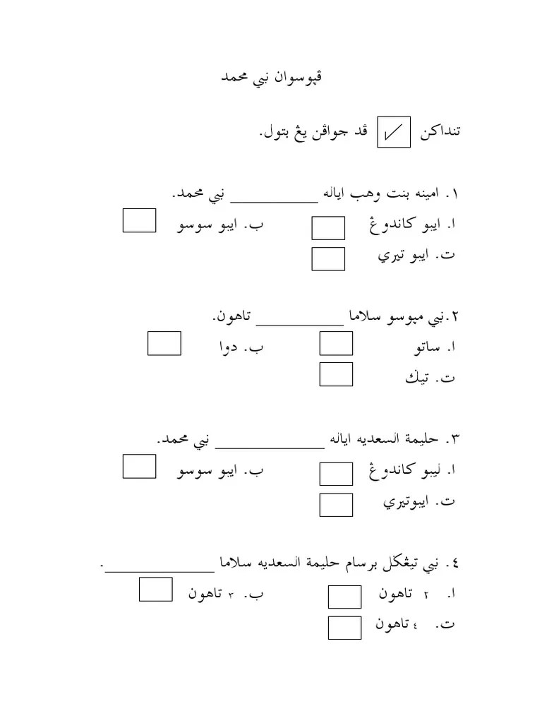 Bank Soalan Sirah Tahun 4 : Buku Teks Bidang Sirah Tahun 2. Soal jawab sirah tahun 4tajuk : Contoh jihad akbar (جهاد الأکبر) ialah? Berikut merupakan contoh dakwah secara perbuatan kecuali. None, add to my workbooks (4) Meningkatkan keupayaan membaca, menulis dan memahami perkataan dan ayat yang mudah dan kompleks dalam ejaan jawi. Perjanjian hudaibiyahsoalan diambil dari buku latihan sirah tahun 4semoga bermanfaatterima kasih. Koleksi soalan peperiksaan percubaan upsr + skema jawapan (semua subjek) . Memenuhi sukatan pelajaran fikah, akhlak, .